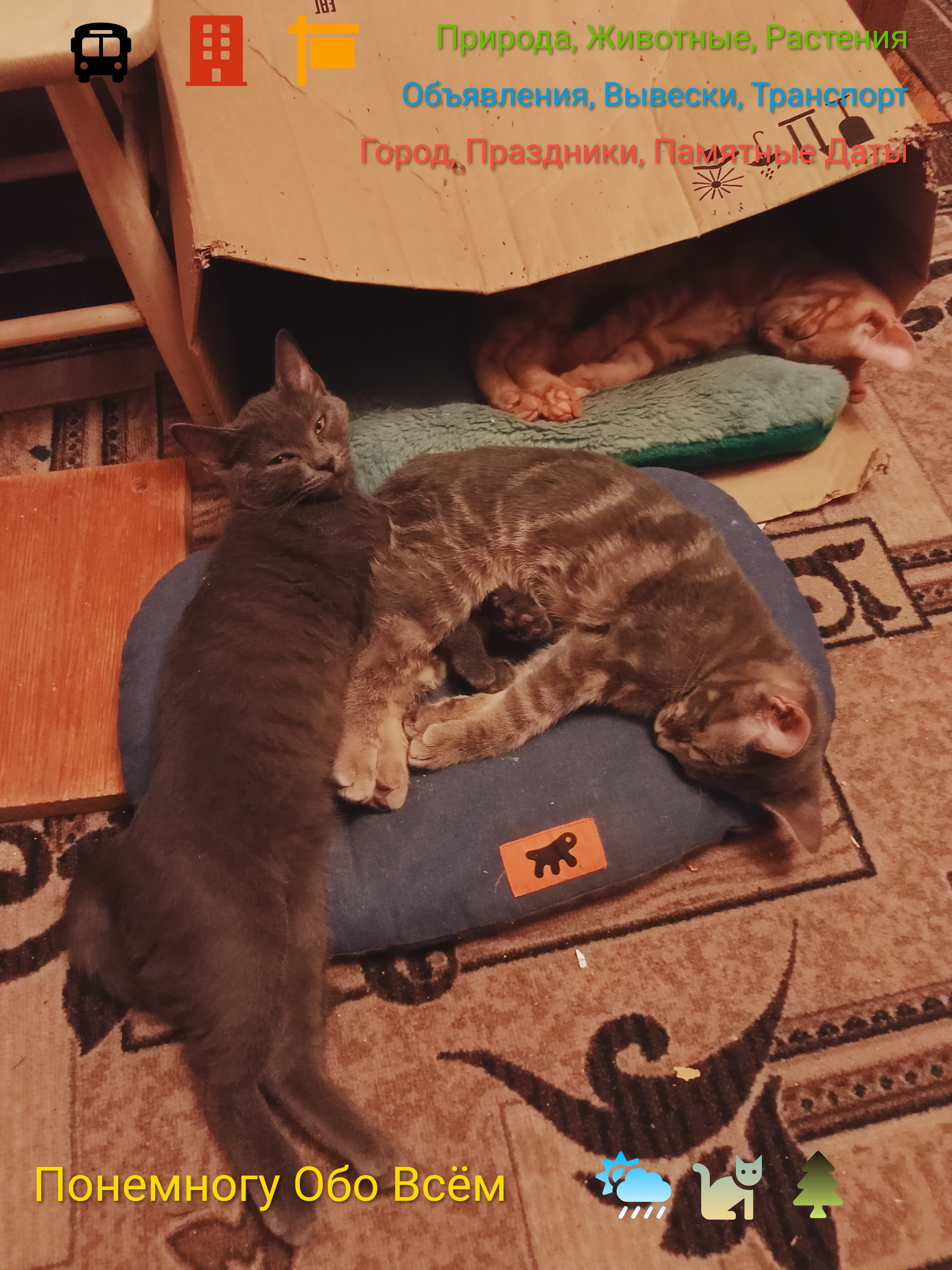 Наша кошка Дымка несколько месяцев назад родила четверых котят совершенно разных окрасов. Они уже вполне подросли, едят сухой и влажный корм, приучены к лотку, игривы и подвижны --- пушистые друзья встречают после работы, нежно целуют и л ...