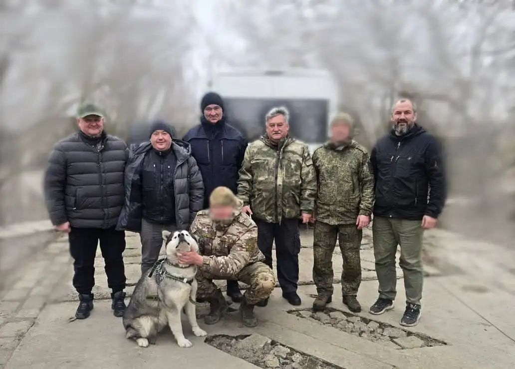 Перед отъездом из полка «Иркут» – фото на память вместе с Босей и её хозяином – начальником штаба полка с позывным «Коршун» и командиром роты управления полка с позывным «Марал». Ждём с Победой домой! #МыВместе